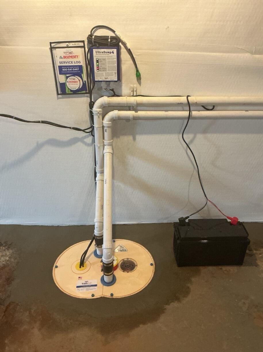 The homeowner decided to get a SuperSump pump, which pairs perfectly with the WaterGuard System. The SuperSump Pump is where the water channeled by the WaterGuard System is poured into. The SuperSump pump takes that water and drives it away from the home through a discharge line, keeping the basement dry all year around.