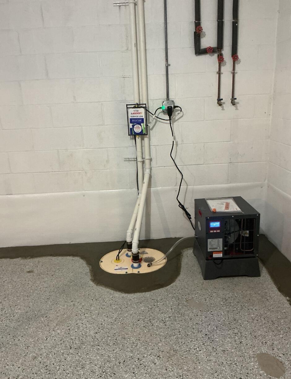 Soon after, it would be time for one of our Foremen, Cisco Berrios, and his crew to install this job. They installed our WaterGuard drainage system below the floor, around the entire perimeter of the basement to collect any water coming in from the walls or floors. Then they installed our TripleSafe sump pump which takes that water and pumps it out of the home at a safe distance. Our SaniDry Sedona dehumidifier was installed to eliminate moisture and mold growth. CleanSpace vapor barrier was put on the walls to direct any water into the drains below. This basement is now fully protected and waterproofed, leaving the homeowner with peace of mind!