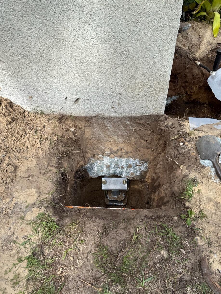 This St. Augustine home was experiencing foundation settlement that caused visible cracking along the exterior wall. Our team installed a helical pier system to permanently stabilize the structure and prevent further movement. The piers were driven deep into stable soil layers and securely attached to the home’s foundation footing using a patented bracket system. After installation, the area was backfilled and restored, leaving the yard clean and the home supported for years to come.