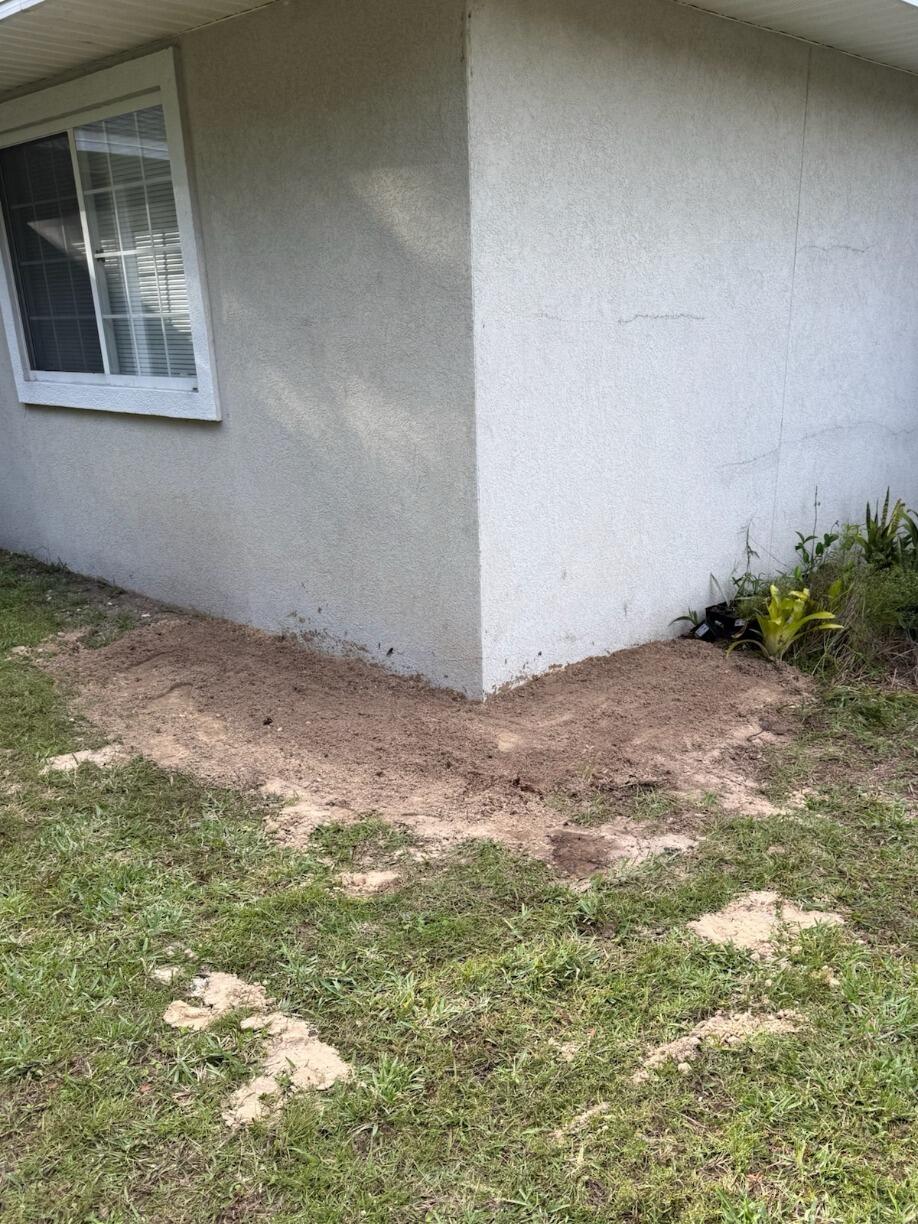 This Saint Augustine home was showing clear signs of foundation settlement horizontal and stair-step cracks running along the stucco siding and chimney, combined with visible discoloration at the base of the wall due to moisture accumulation. The symptoms suggested long-term structural shifting likely caused by unstable soil conditions.
