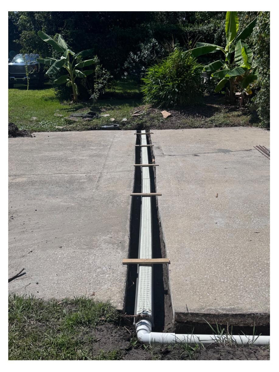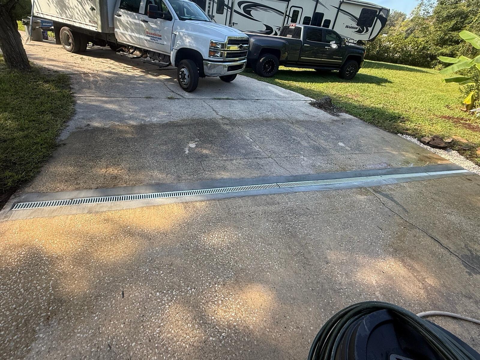 These photos highlight the symptoms of poor water management around the driveway, where pooling and runoff threatened the concrete and surrounding landscape. To solve this issue, a channel drain system was installed directly into the driveway. The drain connects to an underground discharge line, safely redirecting water away from the surface. This solution prevents standing water, protects the concrete from erosion and cracking, and ensures long-term drainage performance for the Green Cove Springs property.