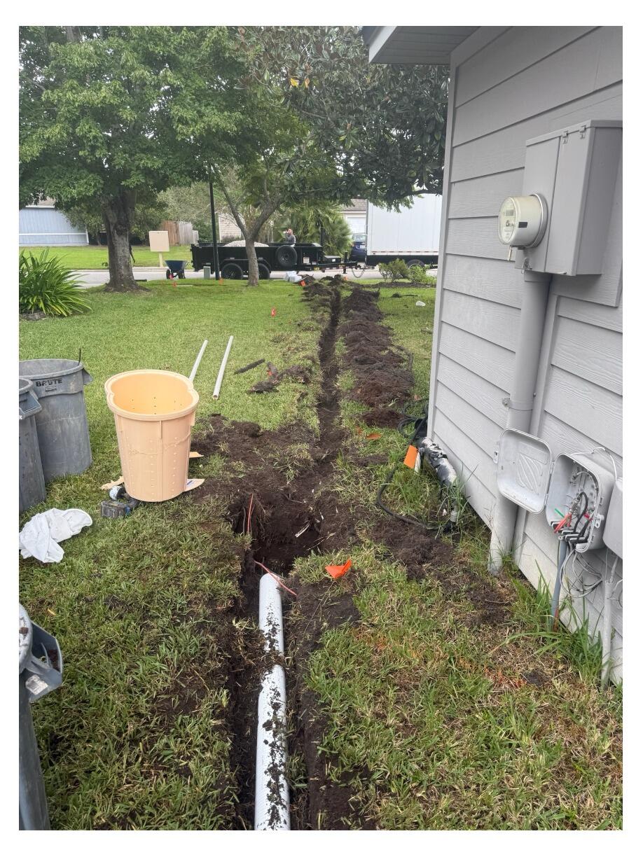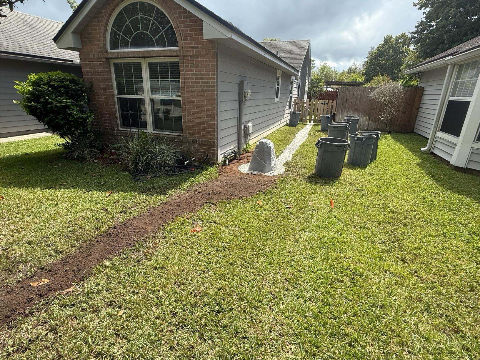 This Jacksonville homeowner was dealing with excess water pooling around the foundation after heavy rains, a common symptom of poor yard drainage. Standing water not only damages landscaping but can also put the foundation at risk if left untreated.