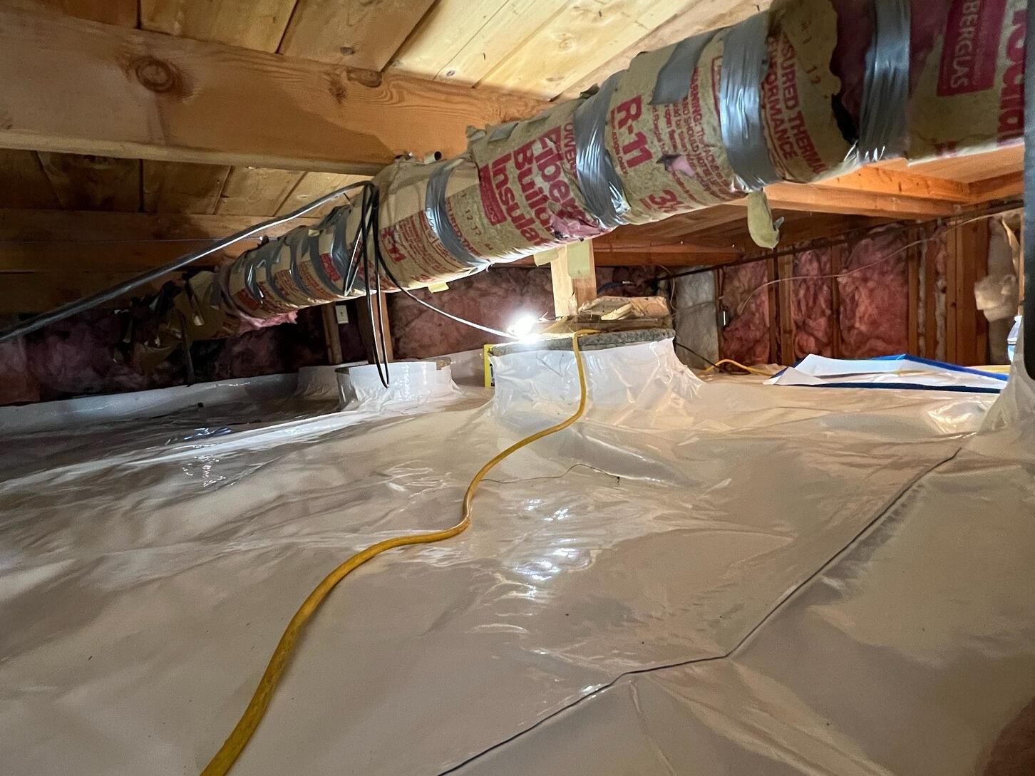 CleanSpace© vaporproof liner is a heavy 20 mil thick liner, manufactured in 7 layers—a blend of high density polyethylene for puncture resistance, low density polyethylene for flexibility, and polyester cord reinforcement for brute tear resistance. An antimicrobial additive called "UltraFresh" is also molded right into the material, resisting mold growth. The white finish brightens the crawl space, and makes it easy to see how clean and safe the crawl space is, making it more accessible as a storage area. We also installed drainage matting beneath the CleanSpace© liner, which adds durability, puncture resistance, and a thermal break for the encapsulation system.