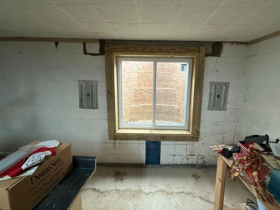 Specialist Terry recommended installing a RockWell egress window system with structural enhancements, including a concrete lintel and wall anchors. Foreman Isaias and his crew installed a 48”x48” white sliding window with a RockWell and lid, reinforced by a 72” concrete lintel and up to two rows of block. To stabilize the foundation wall, two PowerBraces were added.