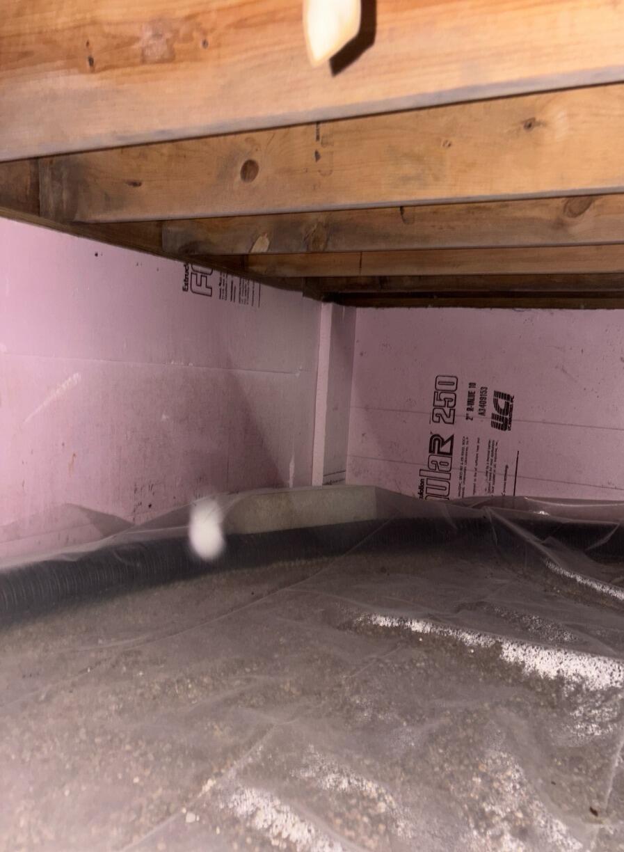 A homeowner in Charlottesville, Indiana had concerns about humidity, moisture, and mold in her crawl space after noticing musty smells rising into the main level of her home. Our Certified Inspector Eric recommended sealing the crawl space ground and walls to prevent moisture from passing through and adding a dehumidifier to control the environment. Our Foreman Sai and his crew members Beto and Nelson encapsulated the crawl space with CleanSpace vapor barrier, installed SilverGlo thermal insulation and a SaniDry Sedona dehumidifier.