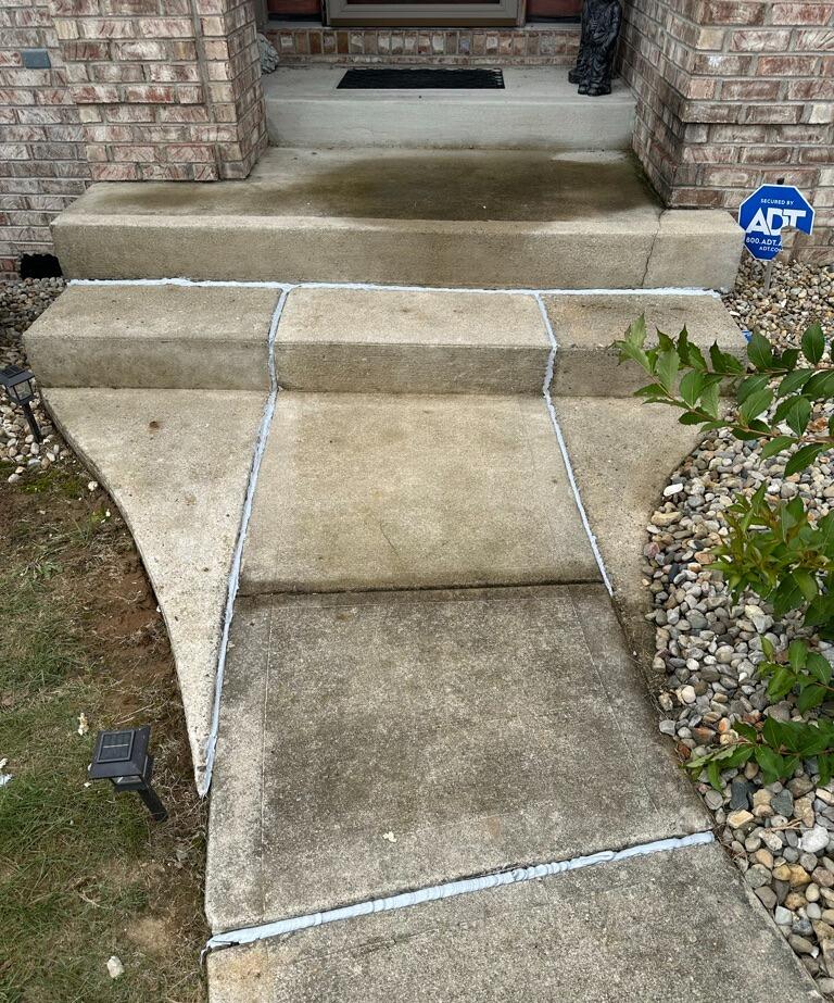 Concrete specialist Casey recommended sealing the cracks and completing an exterior project to reinforce and refresh the area. Foreman Beto and his crew caulked the concrete to prevent further deterioration and improve surface integrity, then completed repairs to the walkway and steps for a clean, stable finish.