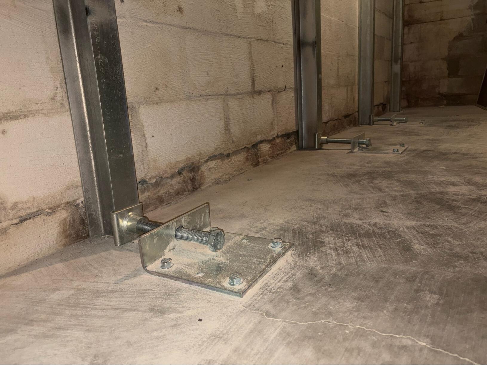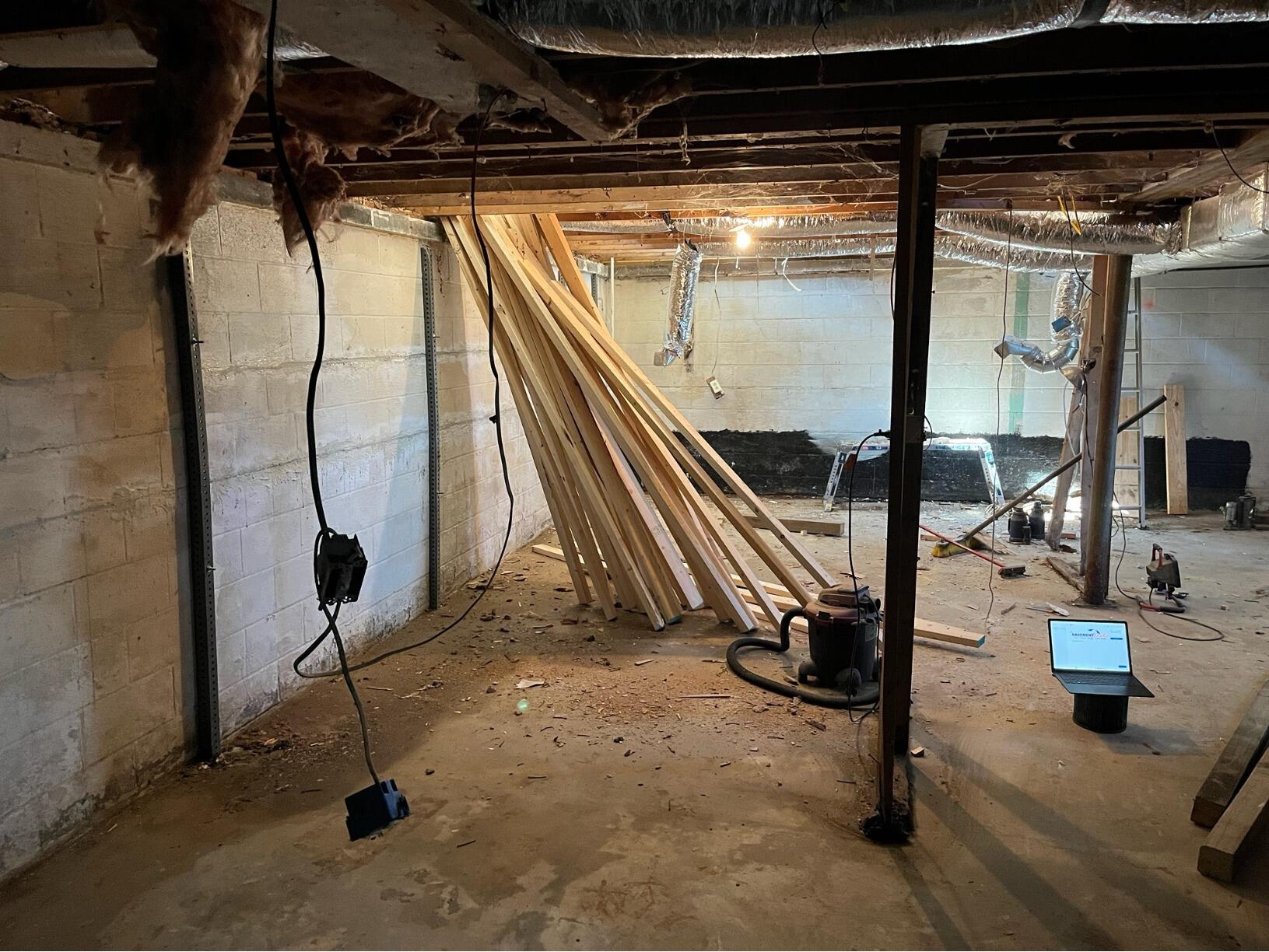 This home's front side wall in Harrodsburg, KY, was moving inwards towards the basement floor. Because the backside of the home features a walkout basement, there wasn't enough opposing soil pressure on that side to suggest a traditional wall bracing system. Without the counterforce, bracing the front side wall could cause damage to the floor joists and even cause the backside of the home to kick outwards near the top of the wall. Because of this situation, we suggested repairing the wall by installing our helical tieback system and our wall anchors. We were able to drill our helical rods horizontally through the front side wall into the soil beneath the lawn in the front yard. After pulling the wall back, we then tarred the wall around the rods to seal the wall, safeguarding it from leaking. Lastly, we anchored the wall with our wall plates to help secure the rods. You may also notice that we waterproofed this basement as well by wrapping the perimeter with our WaterGuard subfloor drains, wrapping the walls with our white CleanSpace vapor barrier, and installing a sump pump (not pictured).