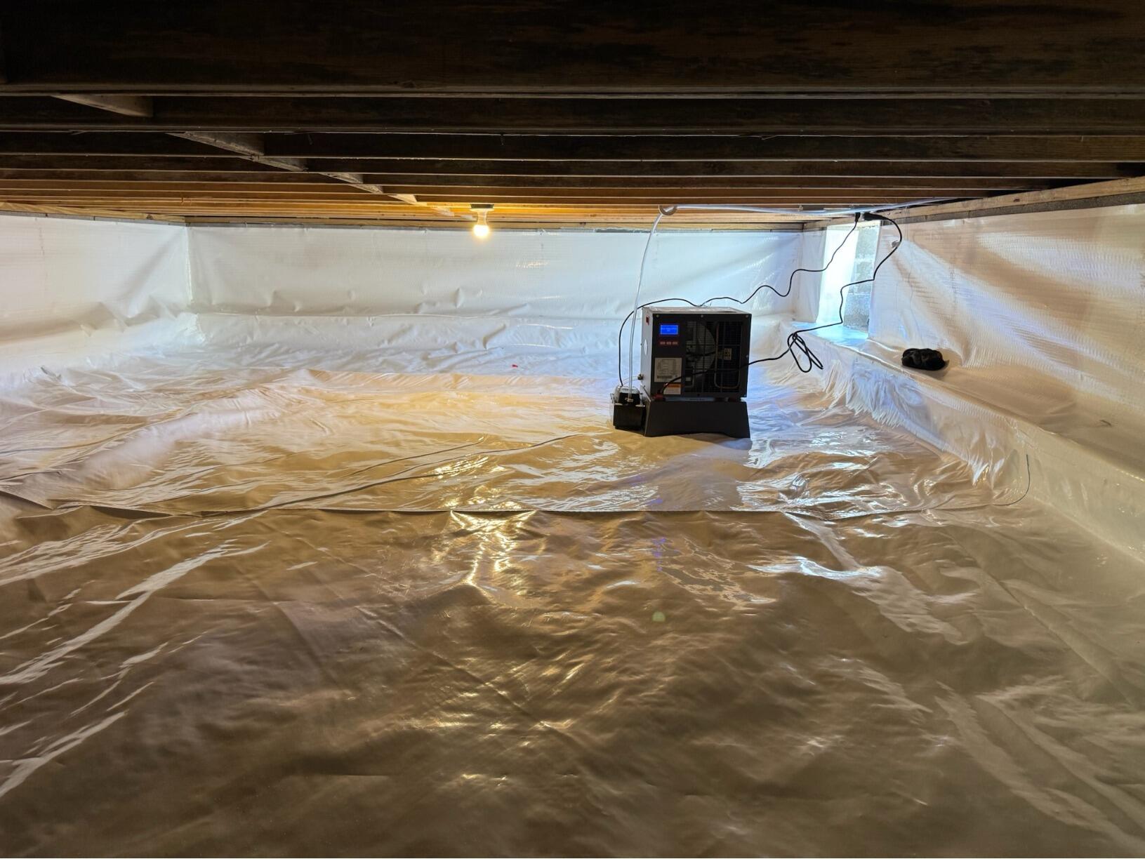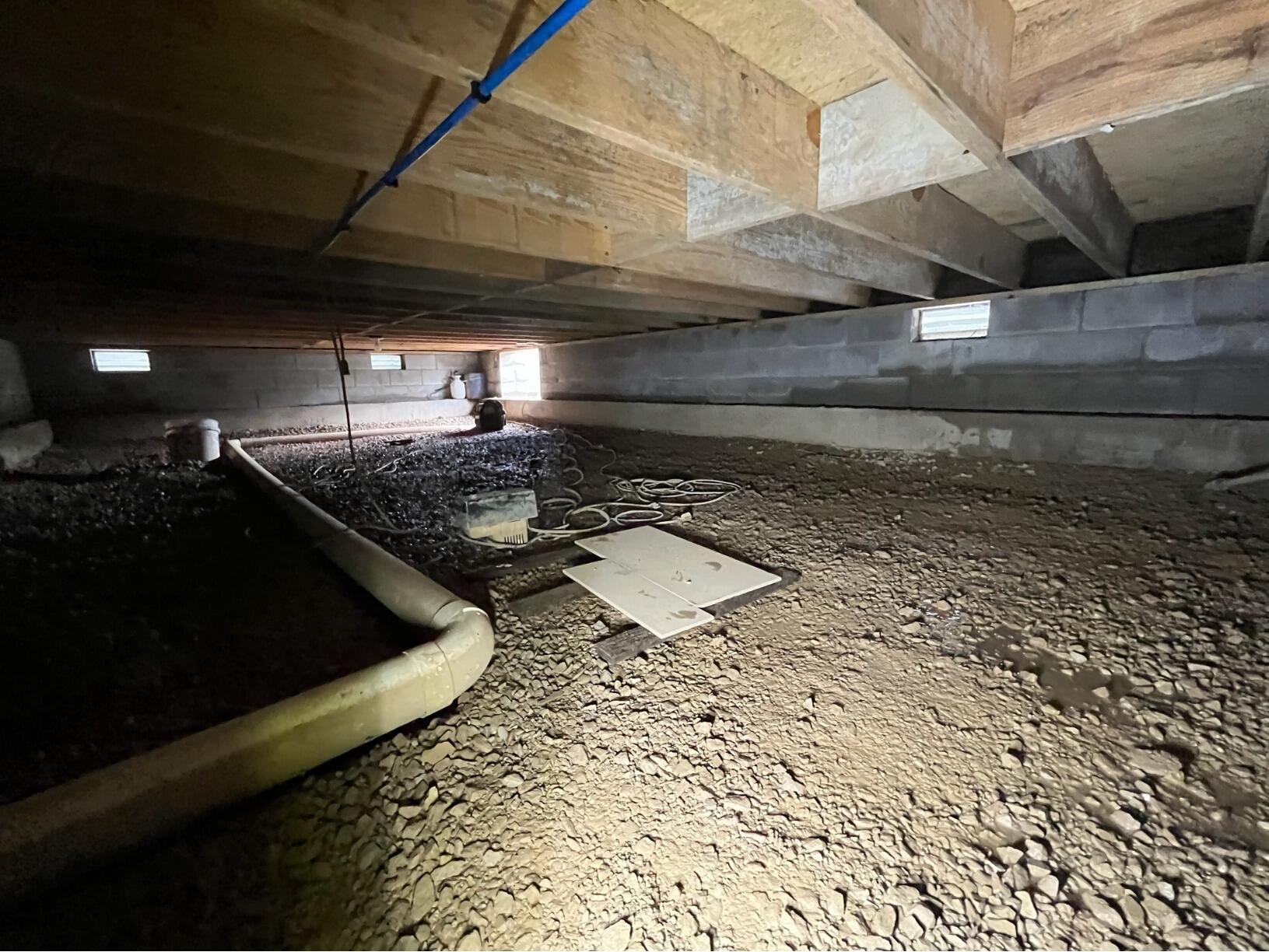 This crawl space had pools of water sitting at the bottom every time it rained. These pools of water were causing mold and moisture issues, which were tearing away at the insulation and wooden frames. In order to fix this, we installed a drainage system made of perforated pipes backfilled with gravel along the interior perimeter of the crawl space. These drains were hooked up to a SmartSump sump pump. We then covered the whole crawl space in Clean Space liner, which is made of non organic material. Thus way mold can never grow on it. We then installed a SaniDry Sedona dehumidifier, which is able to eliminate air moisture issues. We also installed a Turtl crawl space entry door, which is not shown in the pictures.