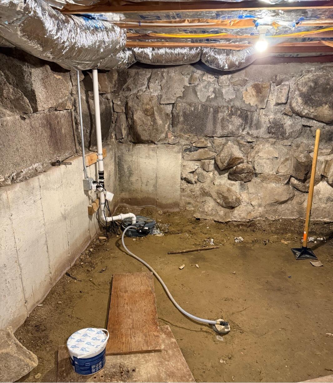 This homeowner in Braintree, MA reached out to us because their unfinished basement was taking on a lot of water in the area that had a dirt floor and fieldstone walls. Our inspector, Connor, went to the home to take a look at the basement and drew up a solution that would make water issues a thing of the past. On installation day, our crew started waterproofing the basement by fully encapsulating the area that had a dirt floor and stone walls, similar to how we encapsulate crawl spaces. This is because dirt and stone are very susceptible to water issues and our CleanSpace vapor barrier seals off the space completely, so it will no longer be affected by outside weather. The crew also installed our SaniDry Sedona dehumidifier and SmartSump sump pump. The SaniDry Sedona keeps humidity in the space low and conveniently drains itself into the SmartSump which sends all of the water out of the space through a discharge line. The homeowner can now rest easy knowing that their frustrations with water in their basement are behind them.