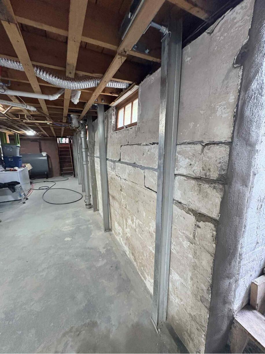 In Rochester, NH, a concerned homeowner noticed their foundation wall bowing inward, jeopardizing the structural integrity of their home. Before fixing the issue, the potentially significant damage is evident in the bowed wall captured in our 'before' photo. To resolve this, we installed our trusted PowerBrace™ System. These preeminent zinc-plated steel beams are precisely fitted to counteract the movement and secure the home’s foundation for good. As shown in the 'after' photo, our solution not only stabilizes the wall but may also reverse previous damage, showcasing the reliability of Erickson Foundation Solutions.