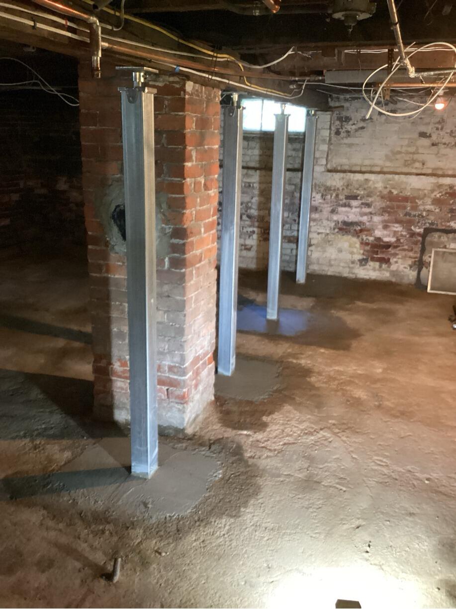 Our Design Specialist, Jason Vachon, recommended installing SmartJacks to stabilize the floor and support the structure of the home. These SmartJacks are similar to Lally columns, but are able to provide extra support to the home. The galvanized steel plate cemented in the foundation is attached to a supplemental support beam by an adjustable steel post. This instantly stabilizes and levels floors.