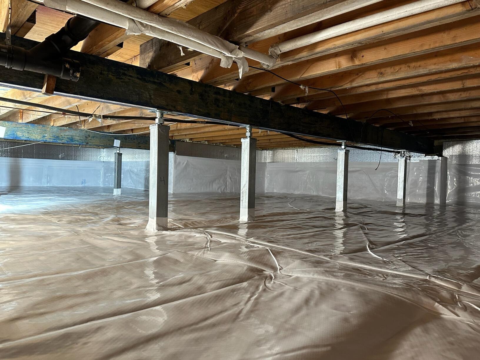 In Ewing, NJ, a homeowner wanted insulation and improvement options for a concrete-floor crawl space with low clearance. We installed CleanSpace, SilverGlo, and SmartJacks to seal the space, improve energy efficiency, and add structural support.
