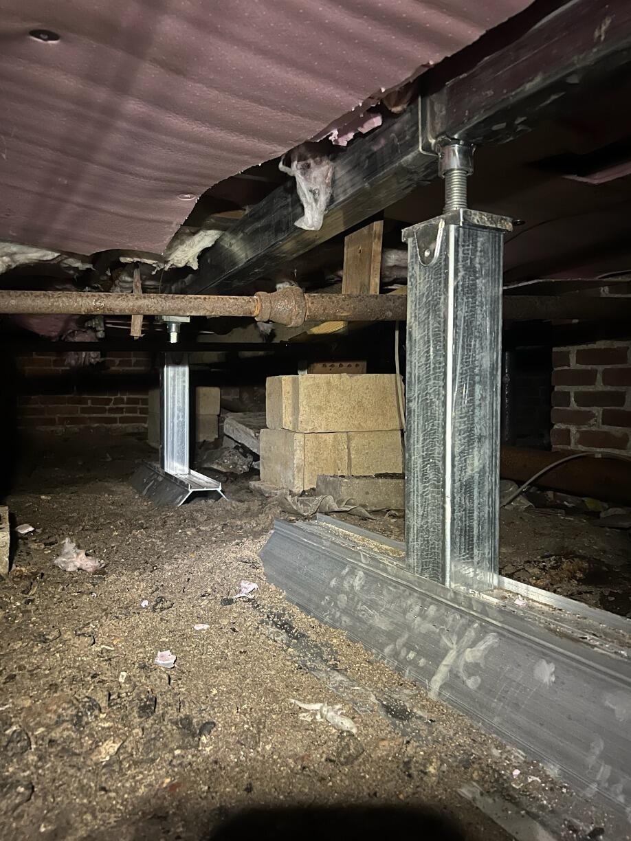 During our inspection, our specialists discovered that prolonged moisture exposure and gradual foundation settlement had caused the crawl space support beams to weaken and deteriorate. This deterioration led to visible bowing in the walls and uneven flooring throughout the home, signaling the need for immediate and permanent structural reinforcement.