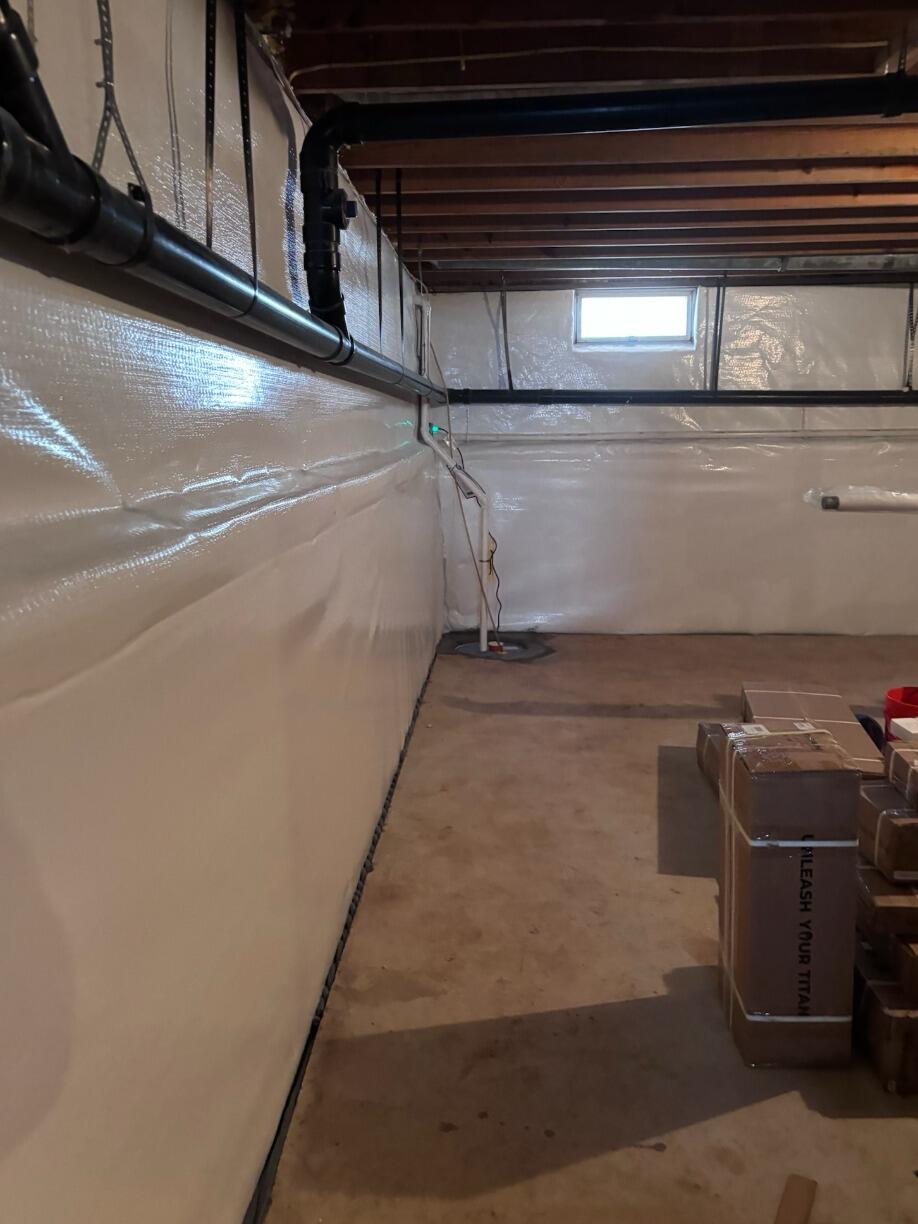 Based on our findings, we created a customized waterproofing system tailored to the home’s needs. First, we installed our WaterGuard Drainage System around the basement perimeter to collect and channel incoming water before it could spread across the floor. To efficiently remove that water, we added our reliable TripleSafe Sump Pump, offering triple protection and backup in case of heavy flooding or power outages. We also installed CleanSpace Wall Panels to act as a moisture barrier and direct wall seepage into the drainage system while improving the basement’s overall appearance. Lastly, we included our IceGuard Discharge Line to ensure the system remains functional during freezing temperatures.
