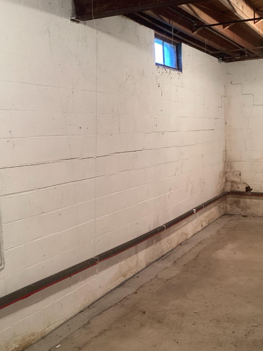 The large horizontal cracks in Caroline's basement were clear signs that the wall had begun to bow and buckle! To help stabilize the wall before it got worse, Frank's Basement Systems installed several I-Beams to add counterpressure and prevent further inward movement.