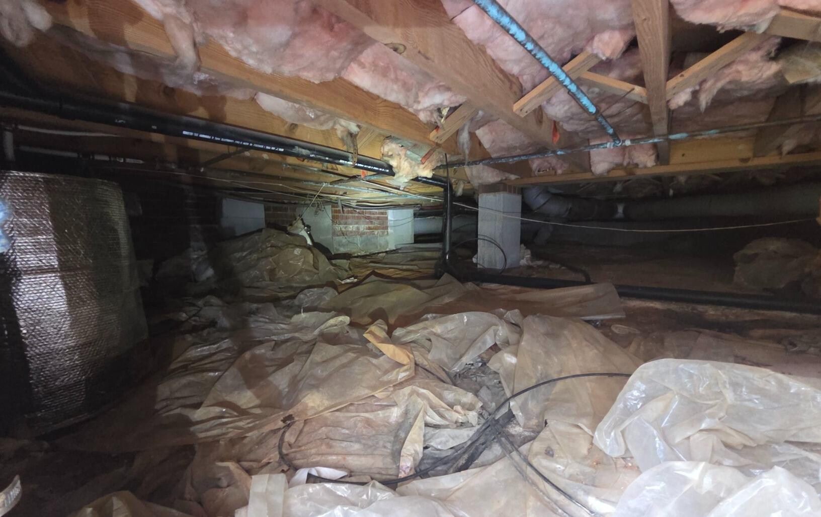 Moisture inside this crawl space was ruining the insulation and causing high humidity. We cleaned out the failing barrier and installed our patented CleanSpace vapor barrier along with other waterproofing products to protect the crawl space permanently.