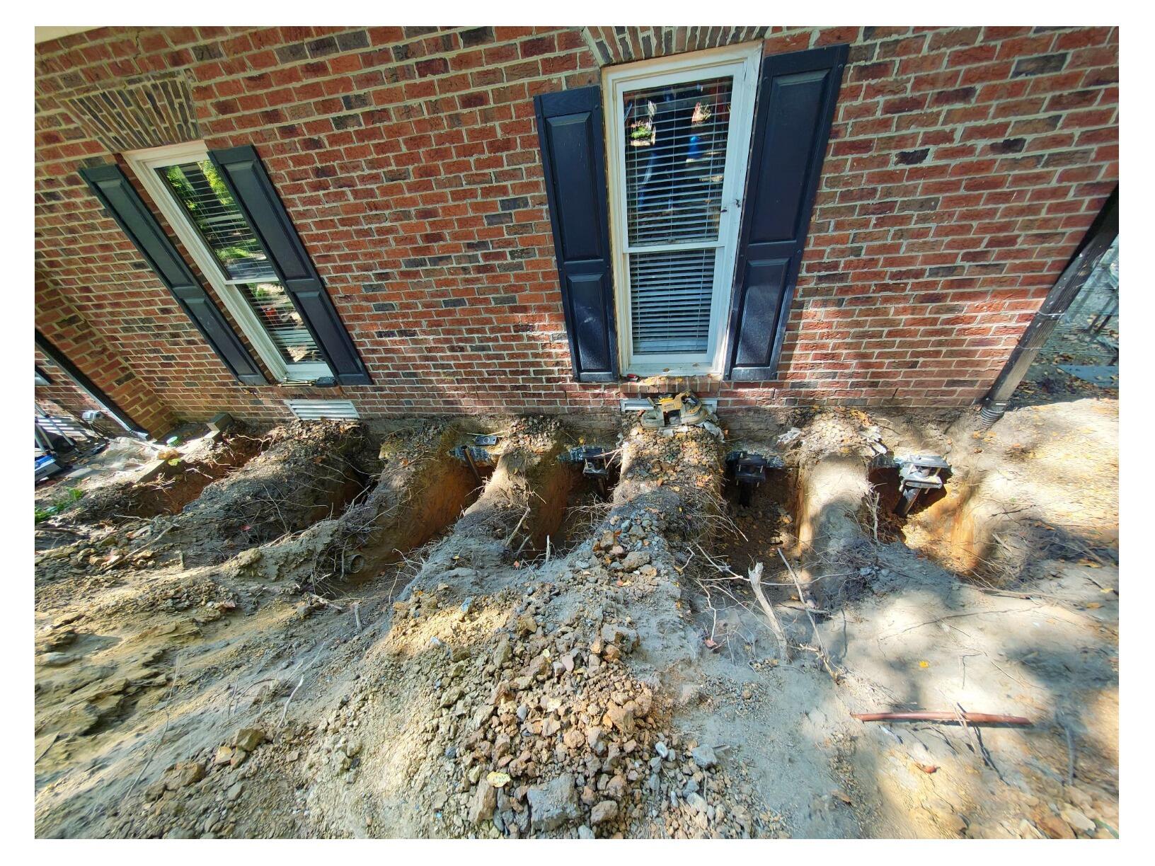 These photos show a foundation repair project completed in Cary, NC, where the home was showing signs of settlement along the brick exterior. Symptoms included visible cracks in the mortar joints and separation around the window frames, indicating movement in the foundation. To address this issue, our team installed a series of helical piers beneath the affected section of the home. By driving these steel piers deep into stable soil, we were able to permanently stabilize the structure, protect against further settlement, and restore peace of mind for the homeowner.