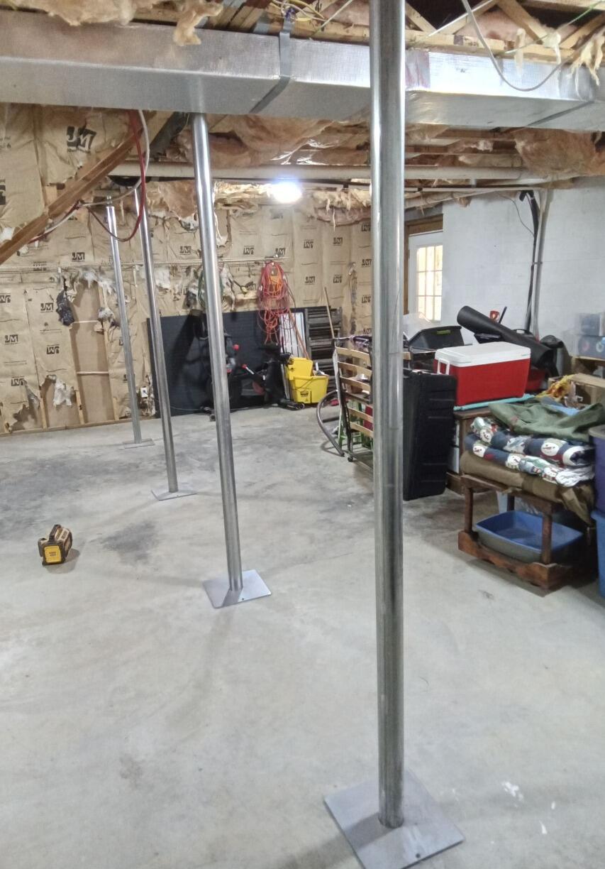 In this West Jefferson home, the original black steel posts had begun to fail over time showing signs of rust, poor footing, and uneven support that allowed the floor system above to sag. These aging supports were no longer providing the stability the structure needed, leaving the homeowner concerned about long-term safety and foundation integrity.