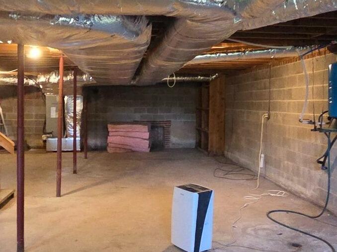 This Germanton, NC basement was showing signs of water intrusion damp concrete floors, water stains, and musty odors that made the space uncomfortable and at risk for mold growth. Without proper protection, moisture can weaken the foundation and damage valuable storage areas.