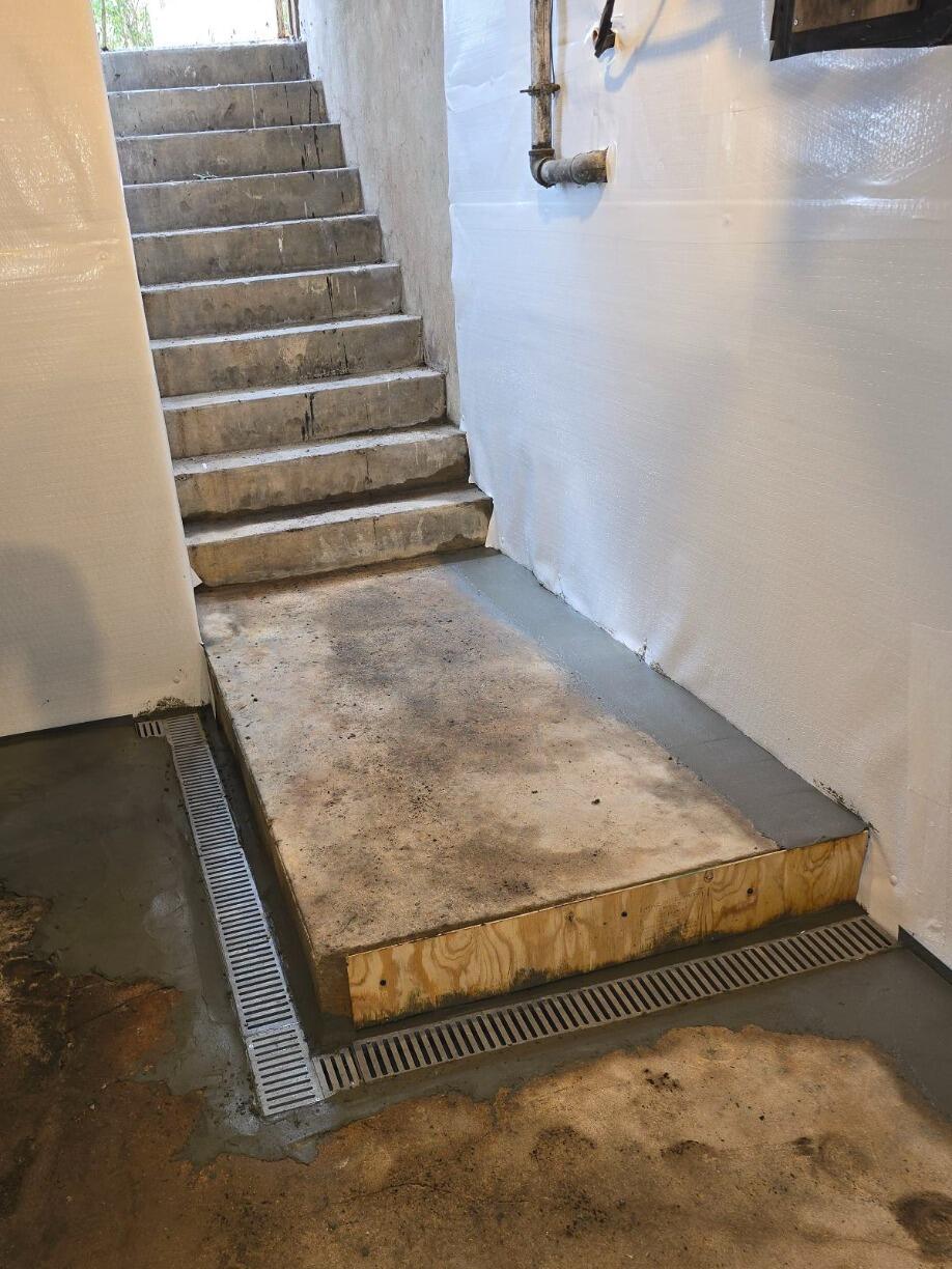 This Raleigh, NC home had a basement stairwell that was allowing water intrusion, leaving stains and moisture damage around the walls and floor. The constant leaks threatened the foundation and created unhealthy conditions in the basement. To solve the problem, our team installed a drain system with trench drain at the stairwell entry, sealed the basement walls with a protective vapor barrier, and re-poured concrete around the perimeter for lasting stability. These solutions direct water away from the foundation, keeping the basement dry and the home protected.