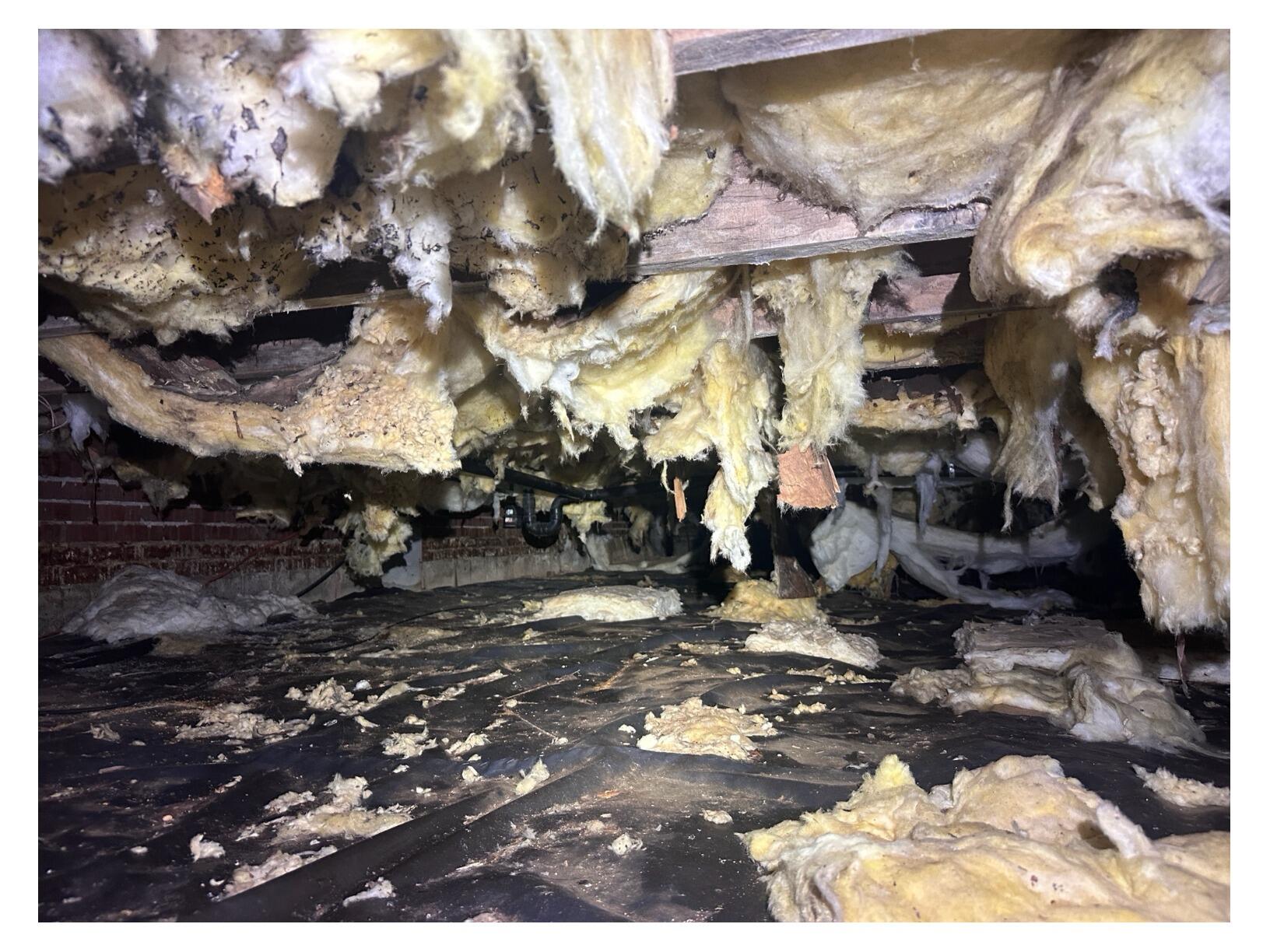 This Dobson, NC crawl space was in rough shape falling insulation, high humidity, and mold growth were clear signs of a moisture problem. These conditions not only damaged the insulation and wood framing but also allowed unhealthy air to circulate into the home above.