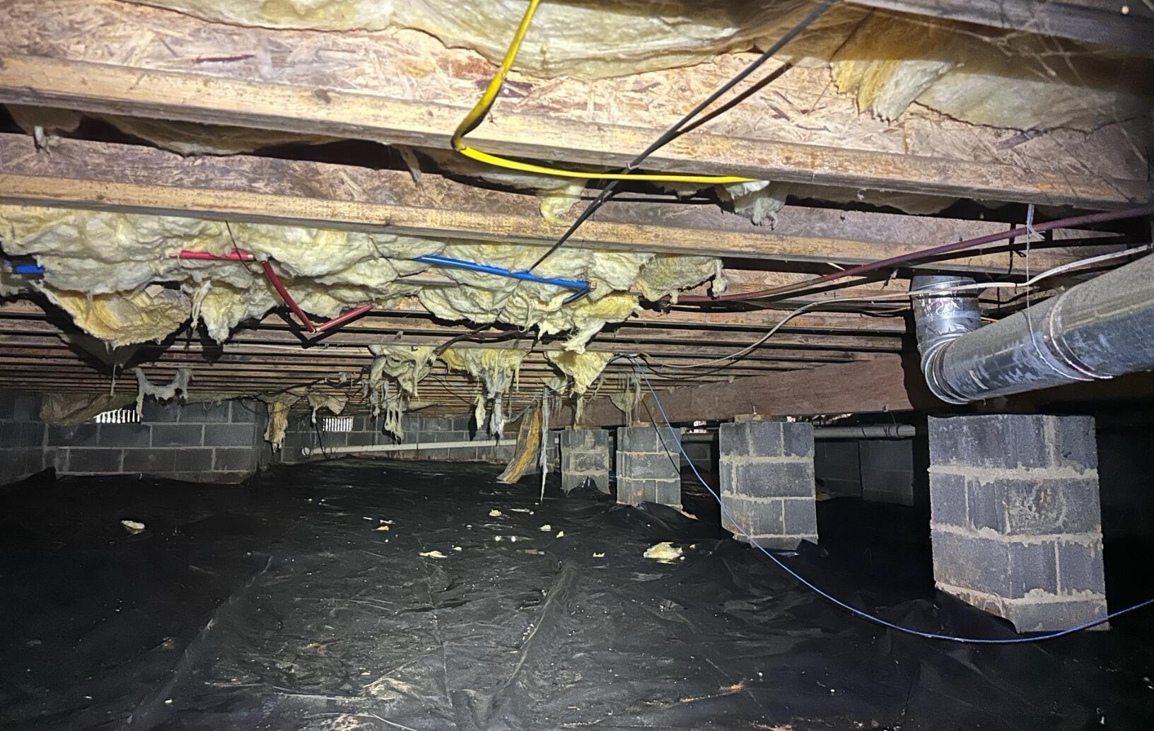 Water was constantly getting into this crawl space making it easy to grow mold, and it started to ruin the fiberglass insulation. These issues were not solved with the existing plastic covering, so to fix the problem we installed our CleanSpace vapor barrier. This barrier keeps excess moisture out of the air and lets the crawl space stay drier.