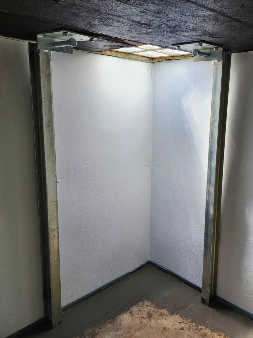 This basement wall in Owensville, OH, had started to bow inward due to hydrostatic pressure pushing against it from the outside soil. The movement was beginning to cause cracks and visible staining along the surface. To permanently stabilize the wall, we installed our PowerBrace Wall Repair System, which uses heavy-duty steel beams to support and gradually straighten the wall over time. We also finished the project by installing BrightWall panels behind the PowerBraces to cover the stained concrete, giving the basement a clean, bright appearance while protecting it from future moisture issues.