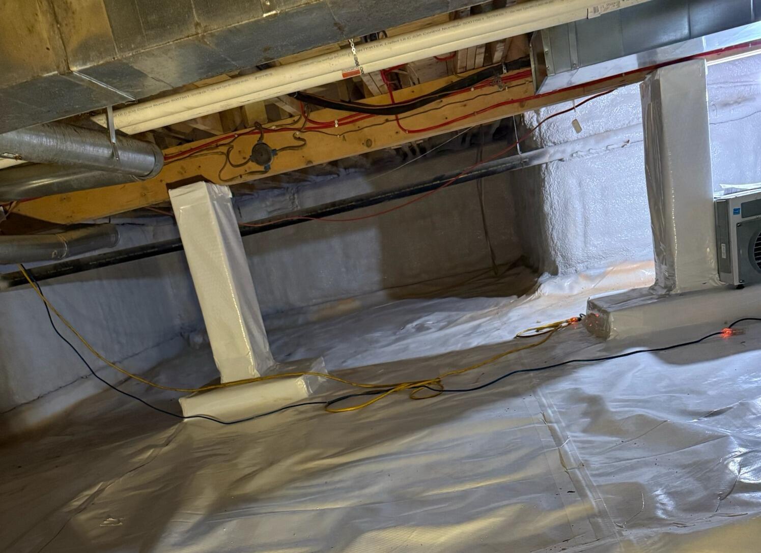 Advanced Basement Systems applied a paint based coating on all exposed spray foam used to insulate the crawl space. The coating is specially designed to meet the code requirements for fire safety!