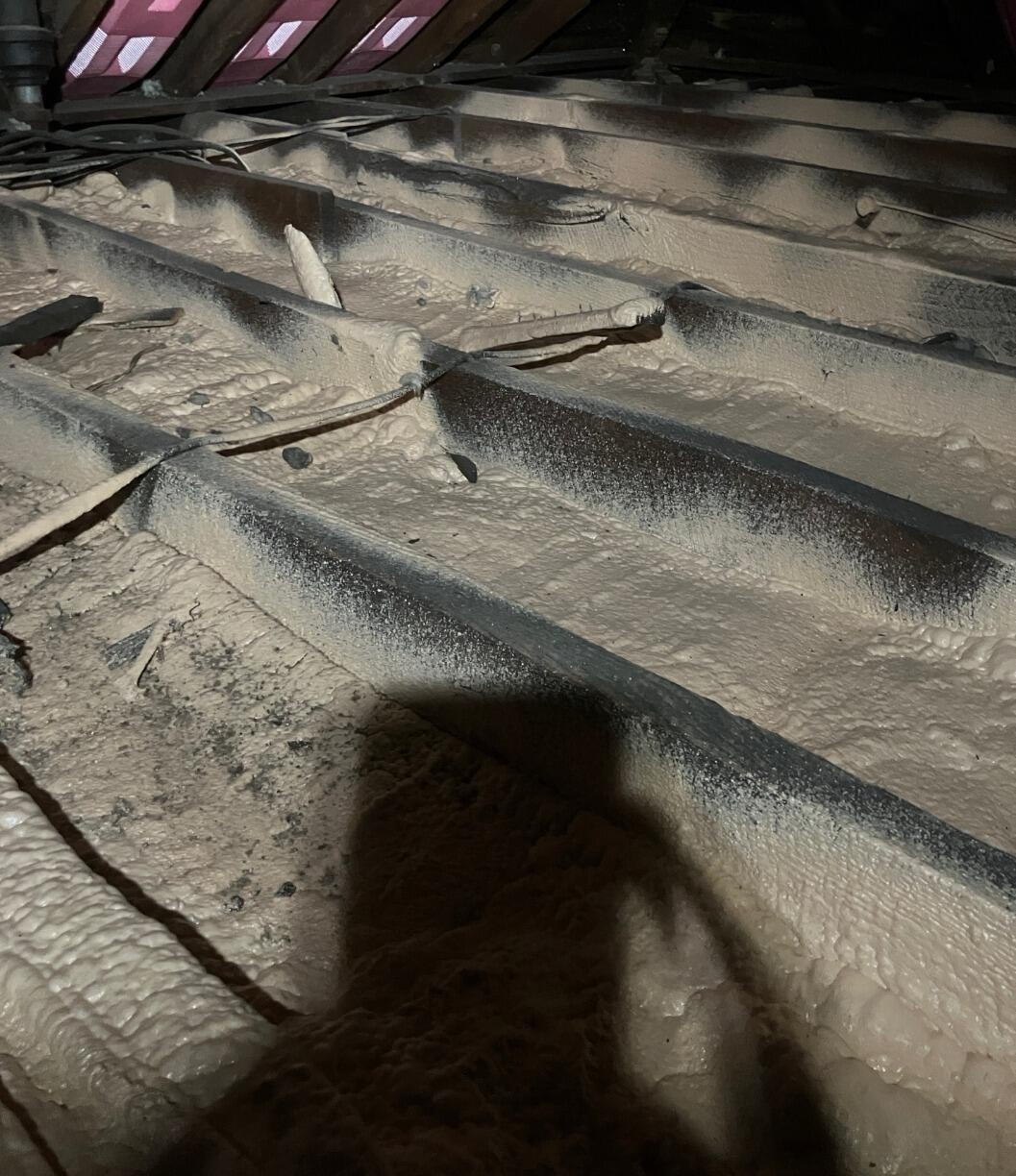 A complete air/vapour barrier is very important for insulation to work best. Many insulation materials will allow air to travel through it as pressure in the home equalizes. Attic insulation is no different. The home was older and did not have a continuous barrier between the living area and the attic. A closed-cell spray foam was applied to provide the barrier.