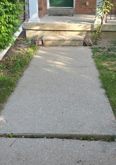 In many Toronto neighborhoods, the changing seasons and shifting soil can do a number on even the sturdiest concrete. This was exactly the case for a local homeowner whose front entrance had become a significant safety concern. Over time, the walkway slabs had settled so deeply that they created a massive tripping hazard right at the steps to the front door. Because the walkway had sunk away from the stairs, the "rise" of that first step had become dangerously high and uneven, making a simple walk to the door feel like a trek over broken ground.