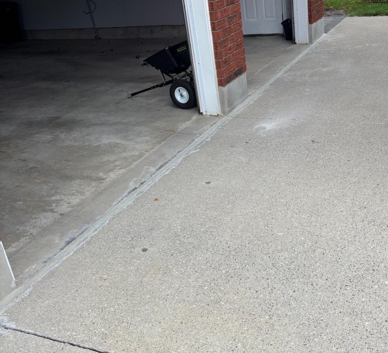 When we arrived at this home in Hampton, Ontario, the concrete driveway had settled significantly, creating a large gap between the driveway slab and the garage threshold. This type of sunken driveway is more than just a cosmetic issue — it creates a serious trip hazard and allows water to pool near the garage entrance, which can lead to ongoing erosion and concrete damage.