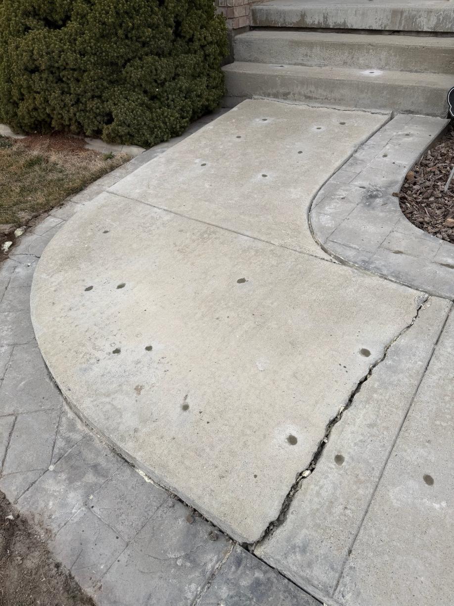 This West Jordan, Utah homeowner was dealing with a severely sunken and cracked concrete walkway leading to their front steps. Over time, soil movement caused the slab to settle unevenly, creating a noticeable trip hazard and separation at the control joint.