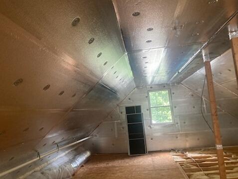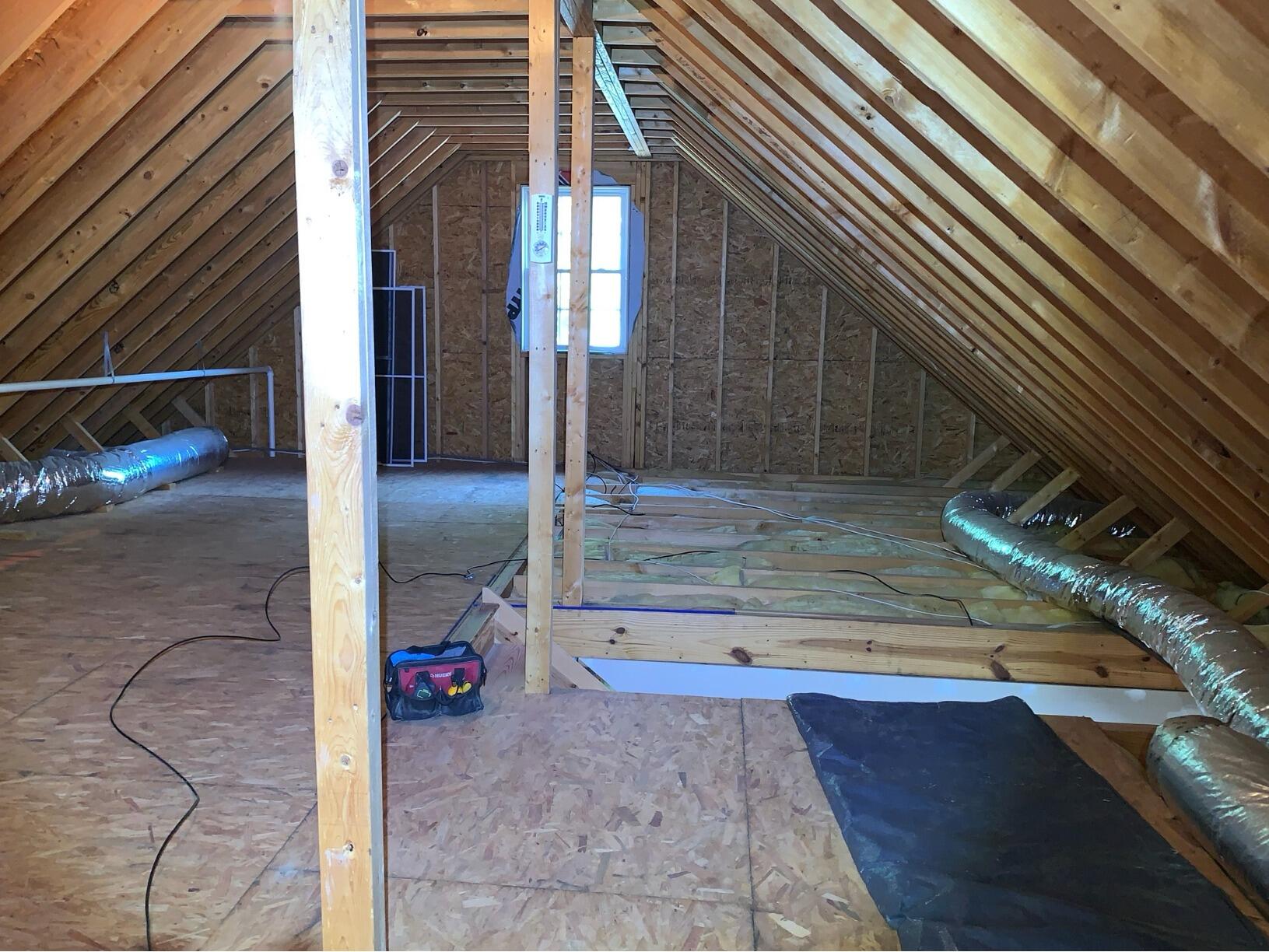 This Williamsburg, VA attic has several dormers. As part of air-sealing and insulating the attic space, we needed to install PVs (the gray rectangles you see between the rafters) to ensure that no insulation fell into the soffits and so that proper ventilation can be maintained in the attic. Then we installed an R-38 of Cellulose Insulation.