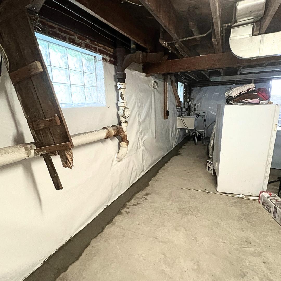 The challenge was clear, as shown in the before photo, with visible signs of water intrusion compromising the basement’s safety and cleanliness. To address the issue, we implemented a comprehensive waterproofing system designed to tackle the problem at its core.