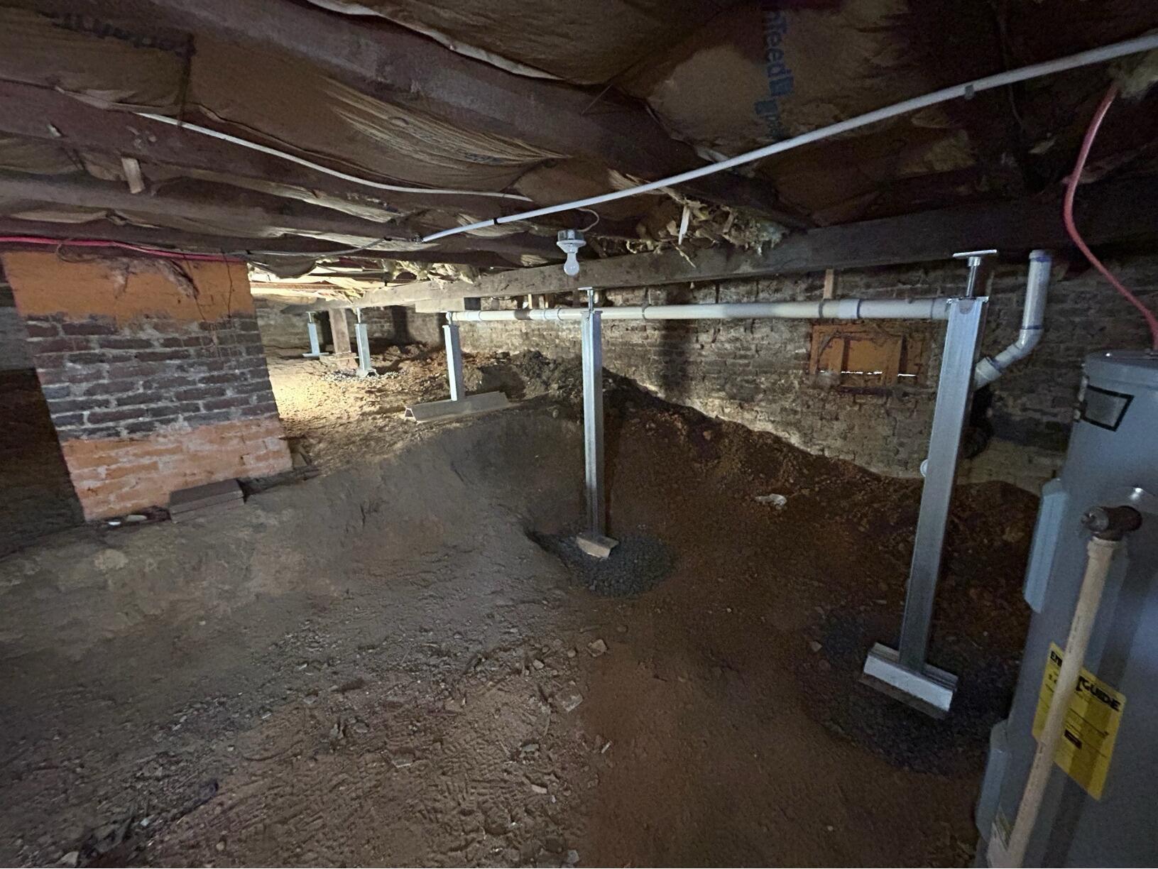 In the before photo, it’s clear that this Richardsville, VA, crawl space was compromised, leading to unstable floors throughout the home. Recognizing the issue of weakened floor joists and foundation soil, we proposed our precise SmartJack® system as a remedy. Our team expertly installed galvanized steel columns on a robust 12-inch steel base to stabilize and restore the flooring to its appropriate elevation. As seen in the after photo, the previously sloping or bouncing floors are leveled and securely supported, ensuring lasting structural integrity for the homeowners.