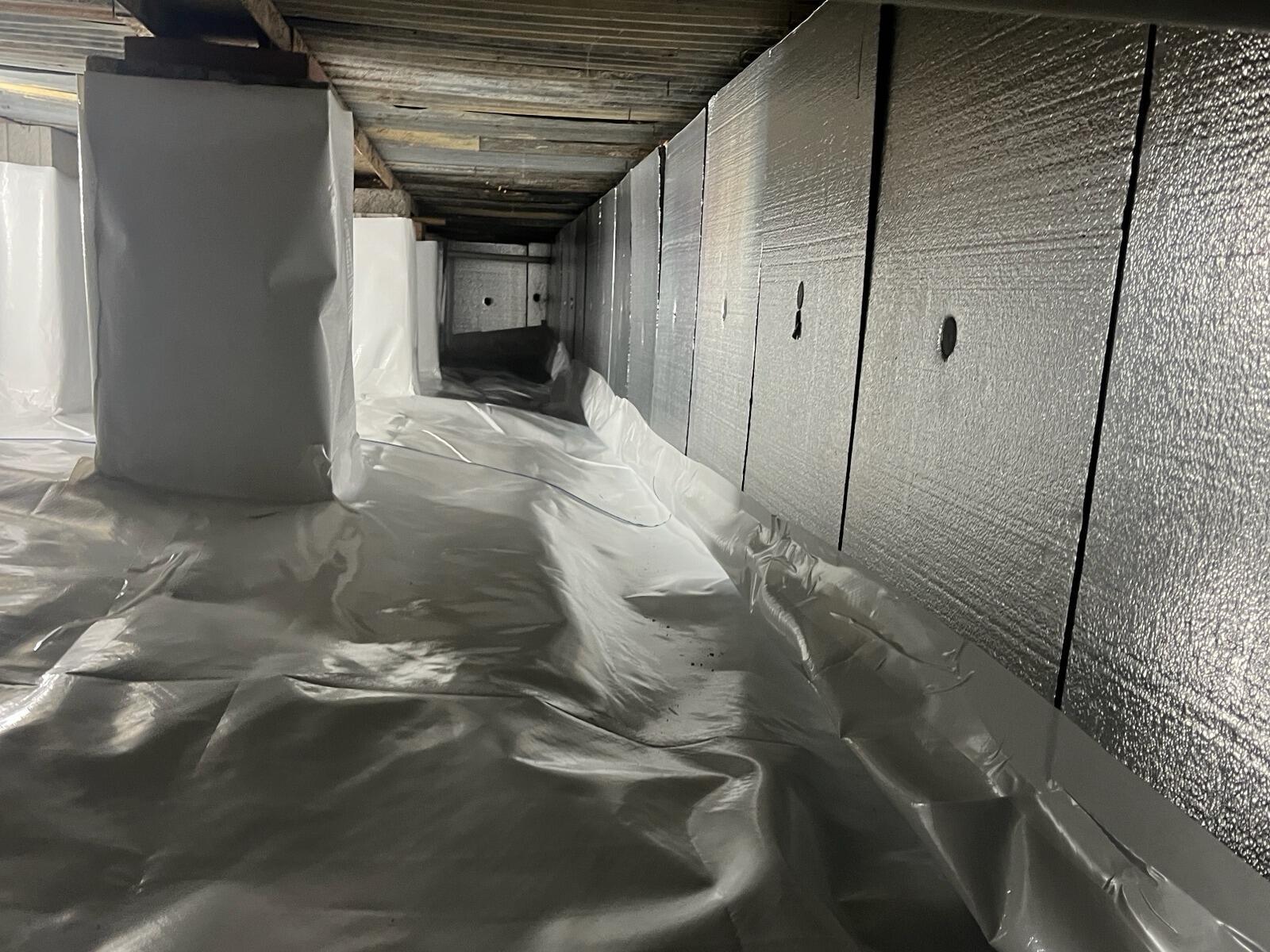 To mitigate the issue, the customer called Alford Foundation & Crawl Space Repair. We installed the CleanSpace vapor barrier system, SilverGlo insulation, and proper drainage. Combined, these ensure the space is protected from water, mold, and direct water flow away from the home.
