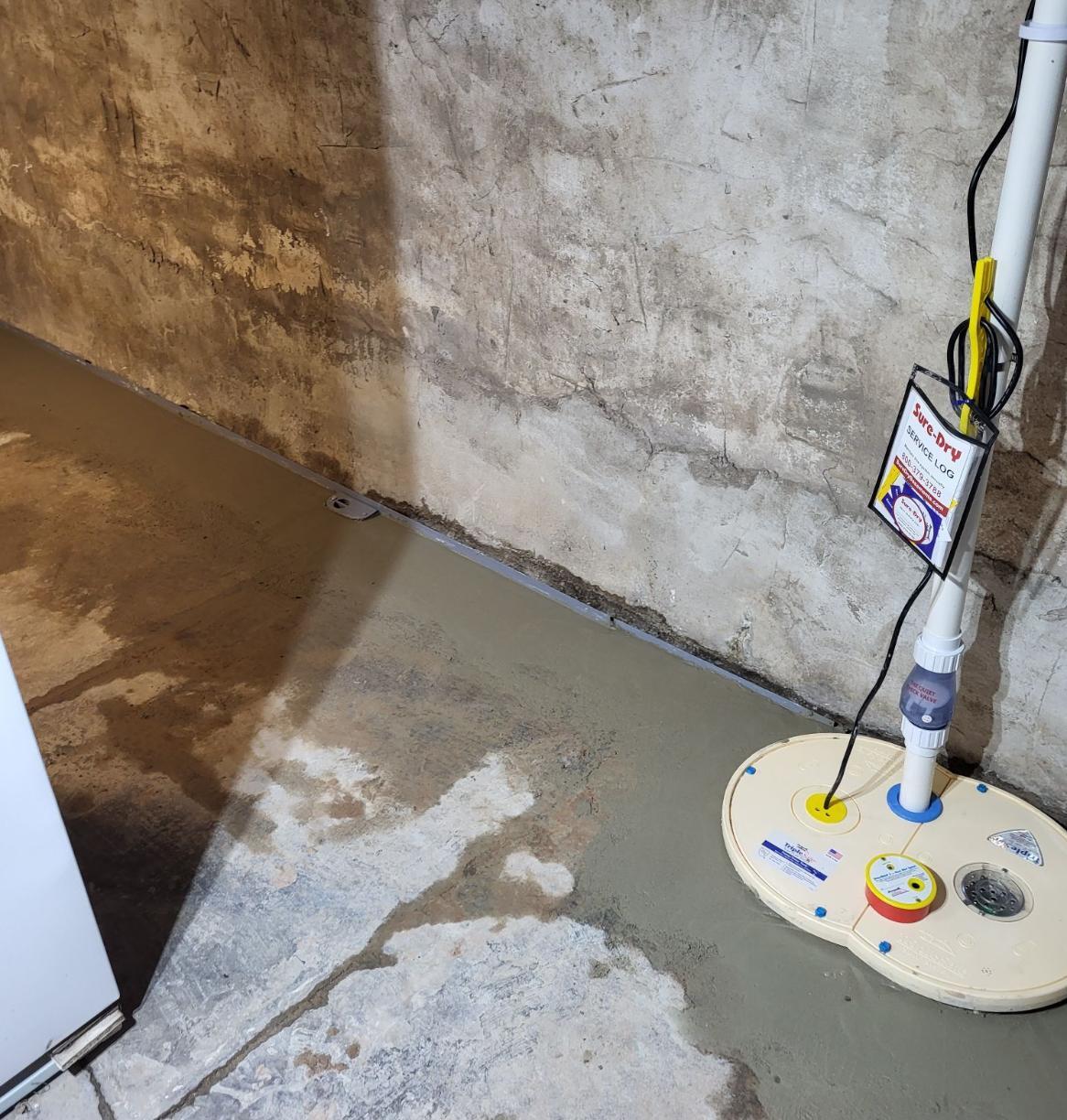 Sure-Dry installed a SuperSump® system to upgrade pumping performance and paired it with a WaterGuard® interior drainage system to capture seepage at the footing. An IceGuard® fitting was added to keep the discharge line functioning even during freezing temperatures, and the exterior line was replaced with a buried discharge for reliable year-round flow. To address moisture concerns on the basement walls, EverLast™ Wall Restoration panels were installed to provide a clean, water-resistant finish.