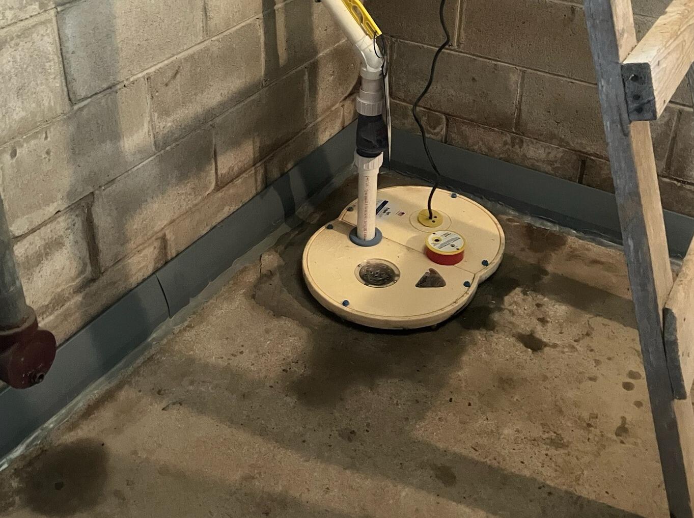 Sure-Dry installed a new SuperSump® system along with DryTrak® to manage perimeter seepage without requiring trenching through sensitive areas of the slab. An IceGuard® fitting was added to protect against frozen discharge lines, and a buried discharge was installed to move water away from the foundation safely.