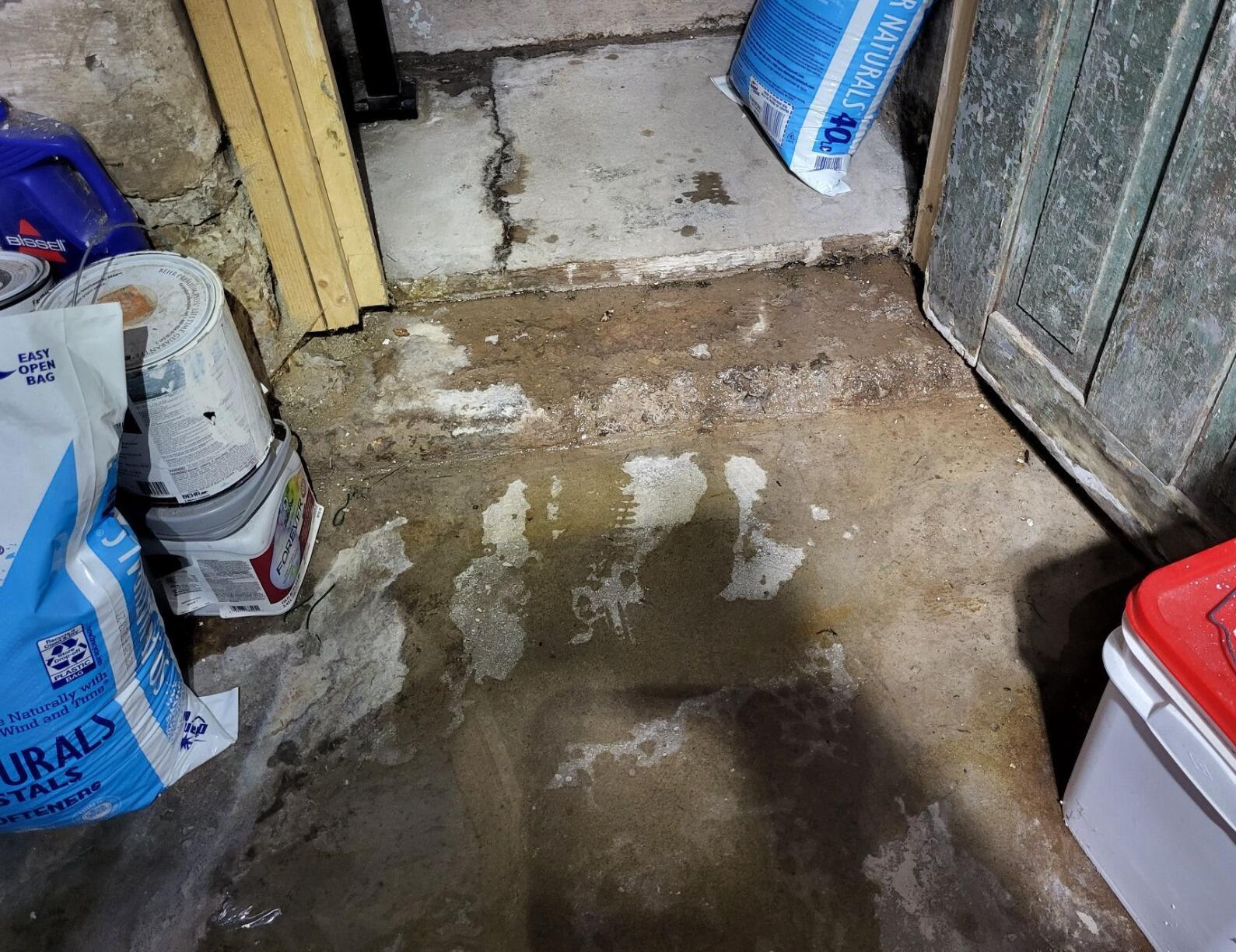 The basement took on water along multiple wall–floor joints after rain and during thaws. Puddles, musty odors, and efflorescence were common, and humidity made storage difficult year-round.
