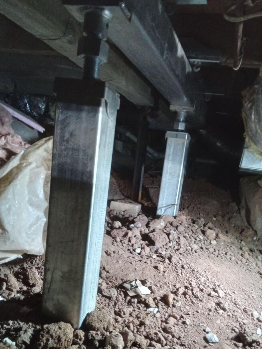 We installed SmartJacks® adjustable steel supports on engineered footings throughout the crawl space, added a supplemental steel beam where spans were over-stressed, and pre-loaded the jacks to re-establish proper bearing and reduce deflection.