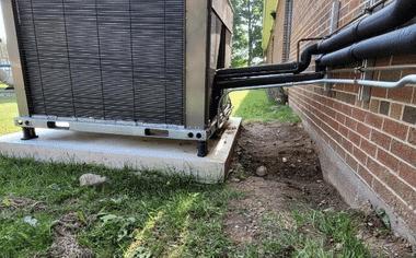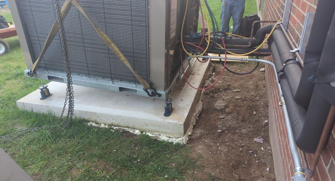 At NWTC's Niagara campus, a small but essential concrete pad supporting a commercial AC compressor unit had begun to settle and tilt unevenly. Over time, shifting soils beneath the slab caused it to sink by several inches—putting strain on the compressor lines and creating long-term risk for the system’s performance and longevity.
