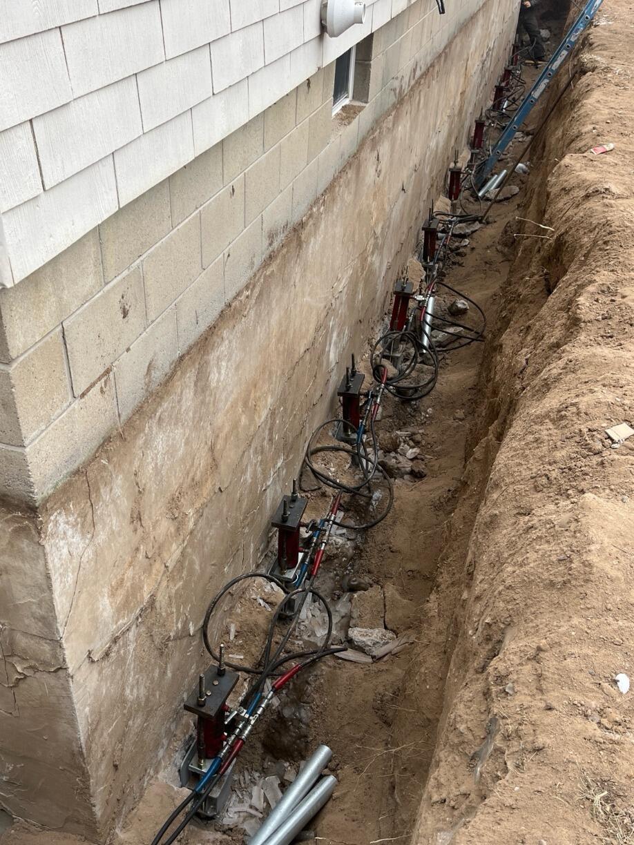 Sure-Dry installed a series of Push Piers to transfer the home’s load past the buried debris and down to stable, load-bearing strata. Each pier was hydraulically driven to refusal pressure, verified by monitored load readings to confirm adequate bearing capacity. Once proper depth and resistance were achieved, the crew performed a controlled lift to recover lost elevation and stabilize the foundation.
