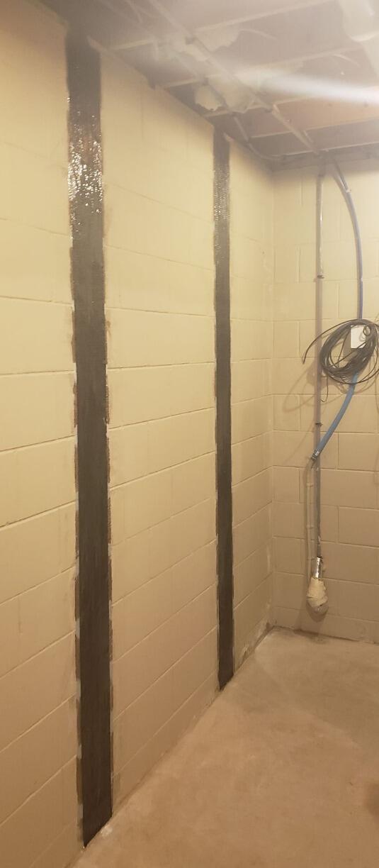 The crew installed the CarbonArmor® wall reinforcement system to stabilize the affected wall. Flexible carbon fiber straps were bonded directly to the wall surface with high-strength epoxy, providing exceptional tensile strength without intrusive hardware or excavation.