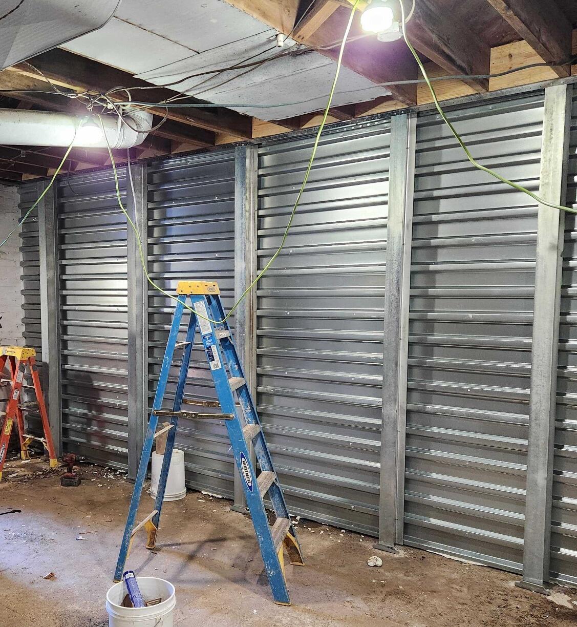 To permanently reinforce the structure while preserving its historic character, our team installed the EverBrace™ Wall Support System. Heavy-duty steel panels were fitted along the failing walls, anchored to the floor and joist system to create a continuous, load-bearing surface. The voids behind the panels were then filled with specialized foam to fully transfer the load, creating a new structural wall inside the old one without disturbing the exterior masonry.