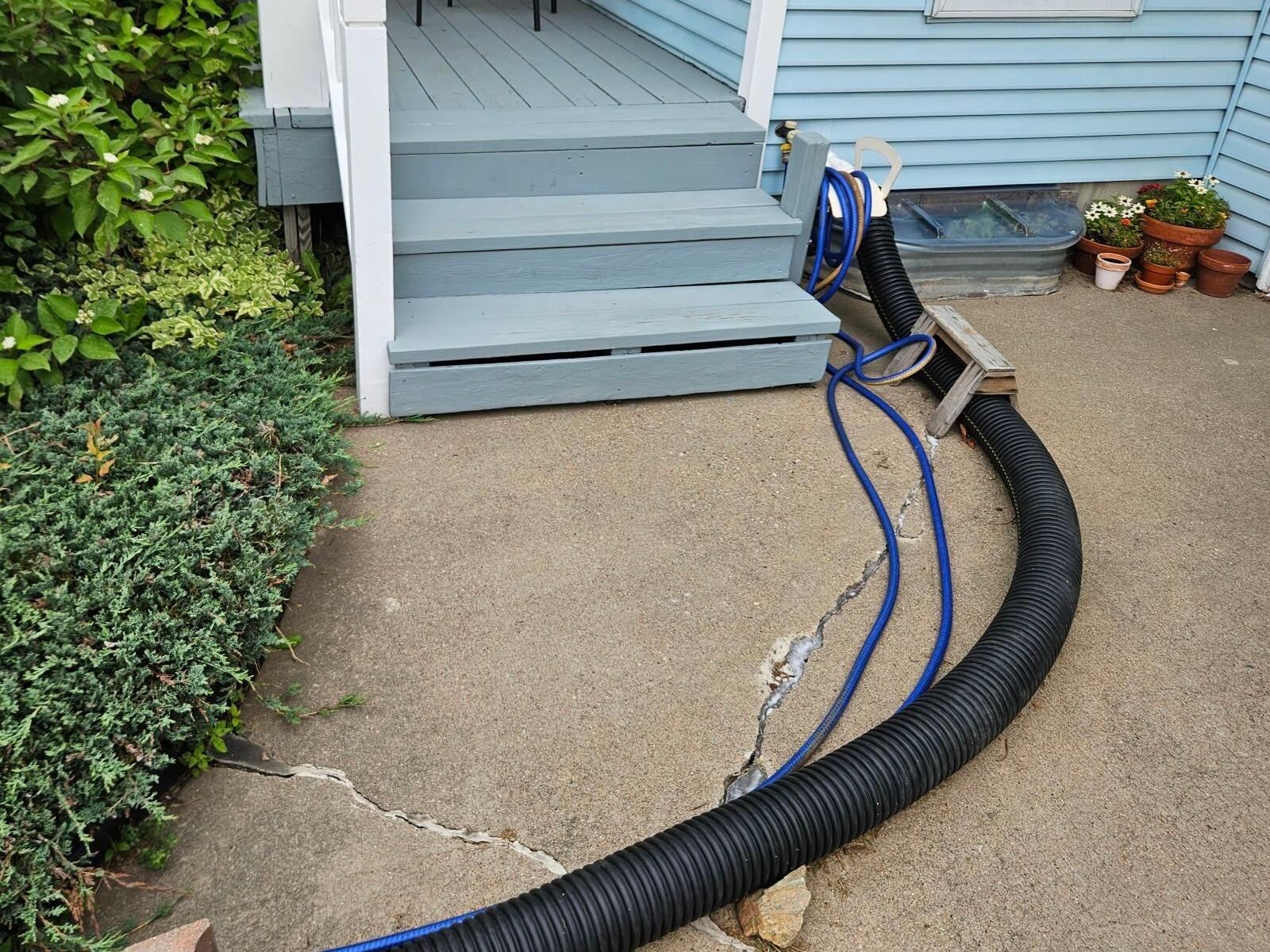 The Sure-Dry team installed an IceGuard drainage system to carry water safely away from the home’s foundation and direct it toward a proper drainage area. This underground system prevents freezing and eliminates surface runoff issues near the stairs while maintaining full sump performance.