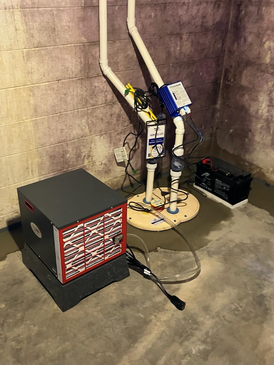Sure-Dry installed a complete waterproofing system featuring the Sedona™ SaniDry™ Dehumidifier, TripleSafe® Sump Pump System, and WaterGuard® Interior Drainage System. Together, these systems capture and channel incoming water to the sump basin, automatically discharge it safely outside, and maintain low humidity levels to prevent mold and odor.