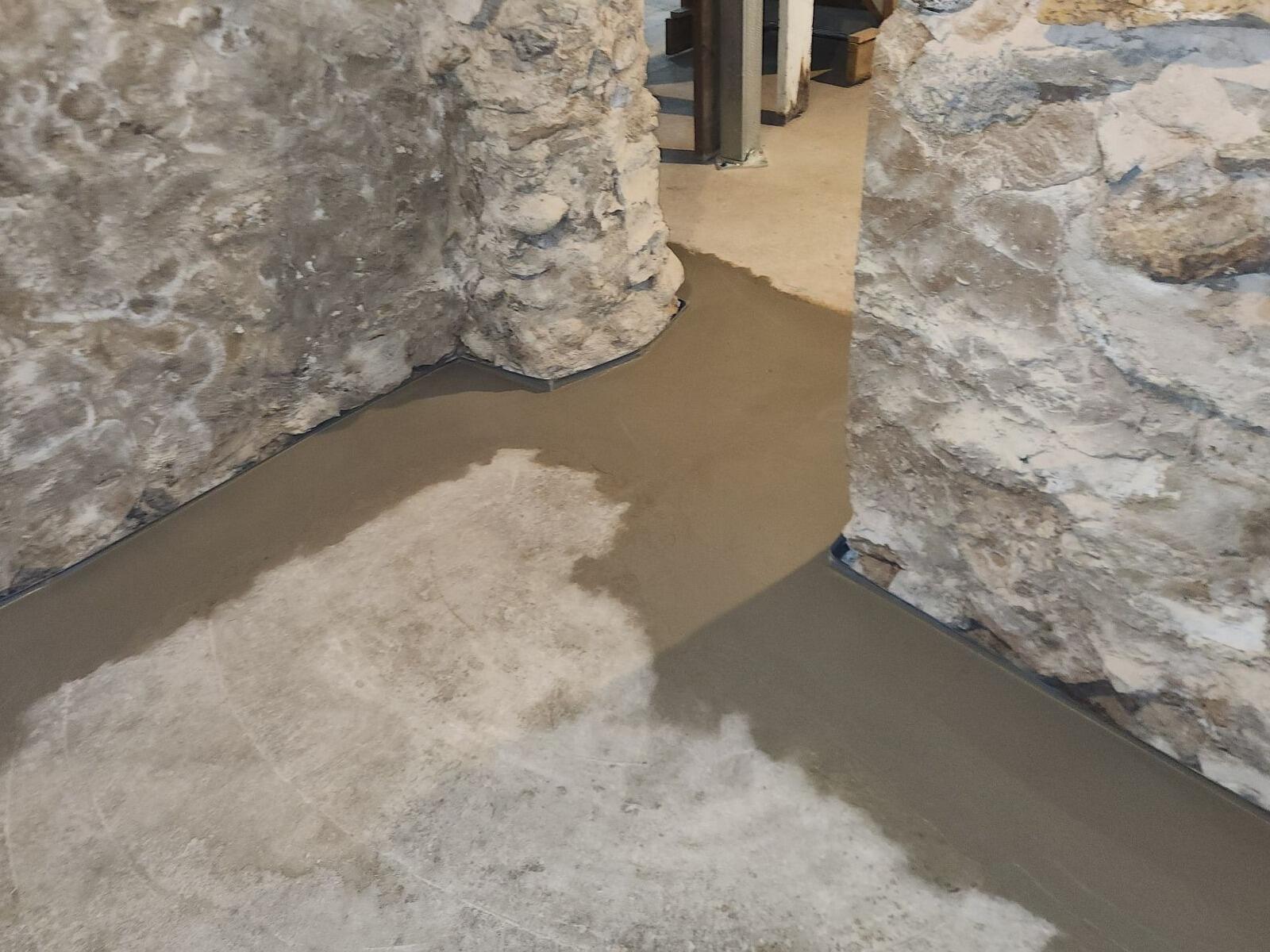 We installed WaterGuard® interior perimeter drainage to intercept seepage at the cove joint and route it to a TripleSafe® sump system (primary, secondary, and battery-backup pumps under a sealed lid with alarm). To stabilize moisture in the air, we added a SaniDry™ dehumidifier set to maintain ~45–50% RH with a dedicated drain.