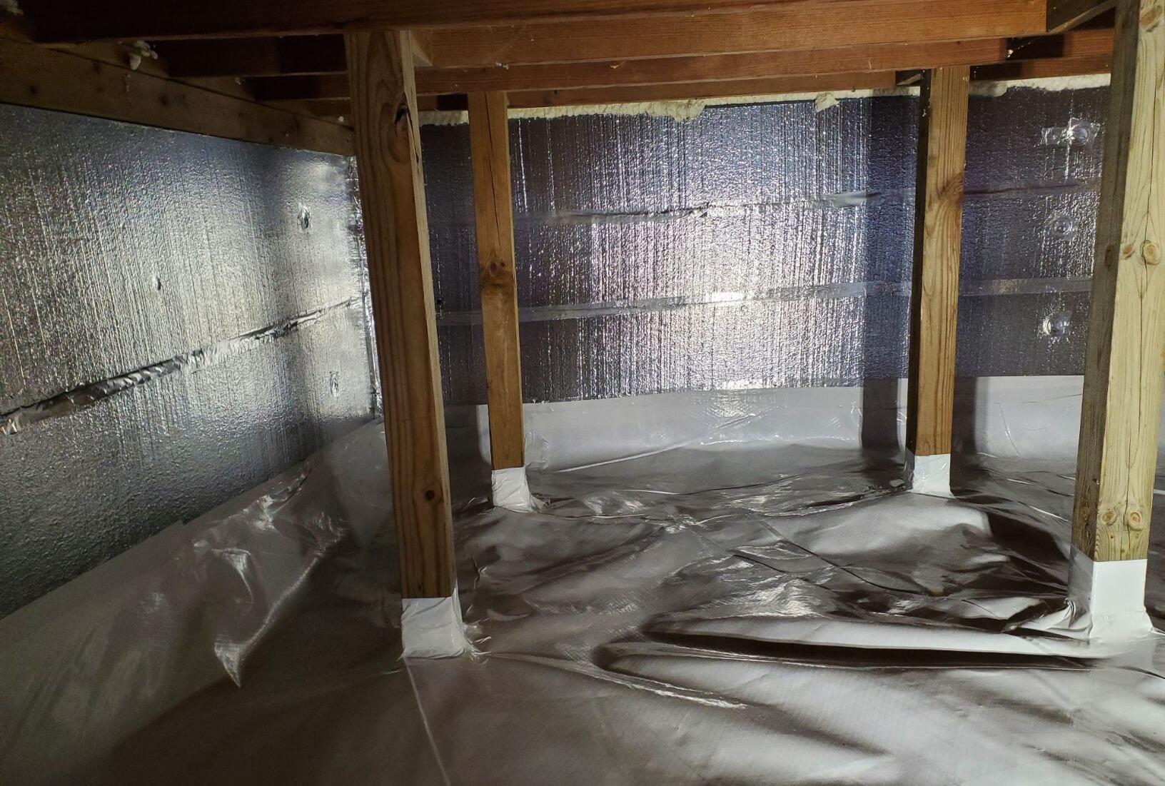 We installed CleanSpace® to encapsulate the floor and walls (wrapping piers and sealing all seams), insulated the walls with SilverGlo® rigid foam, and air-sealed the rim joists and penetrations using RimTight™.